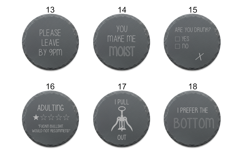 These laser-engraved square slate coasters feature cheeky puns and innuendos that are just the right amount of naughty — perfect for parties, bars, man caves, or as a hilarious gift for friends who can take a joke.