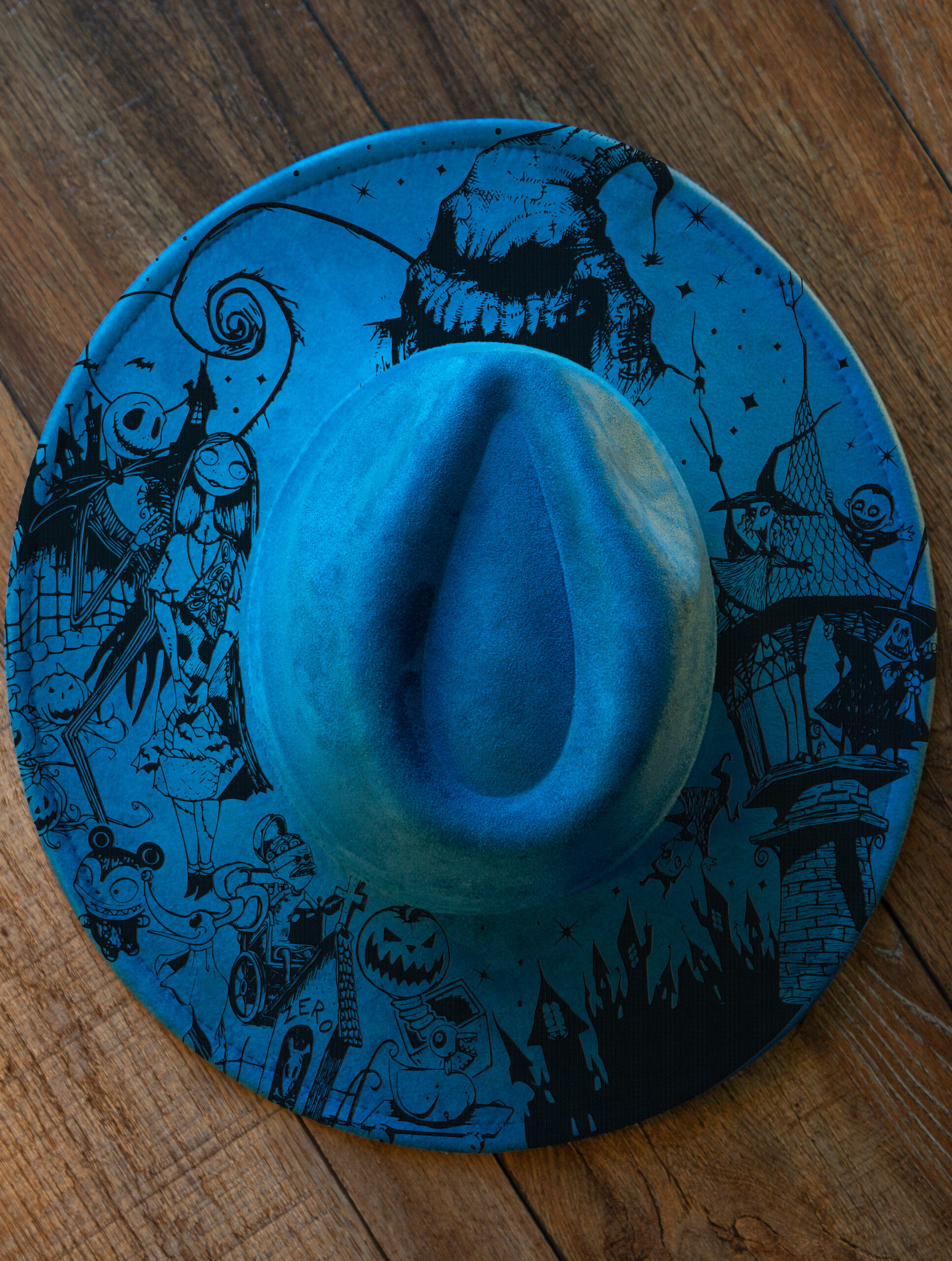 I designed this hat for those who love spooky charm with a playful twist. The engraved artwork wraps around the brim, creating a detailed scene inspired by gothic fairytales, spooky towns, and Halloween-meets-Christmas vibes.