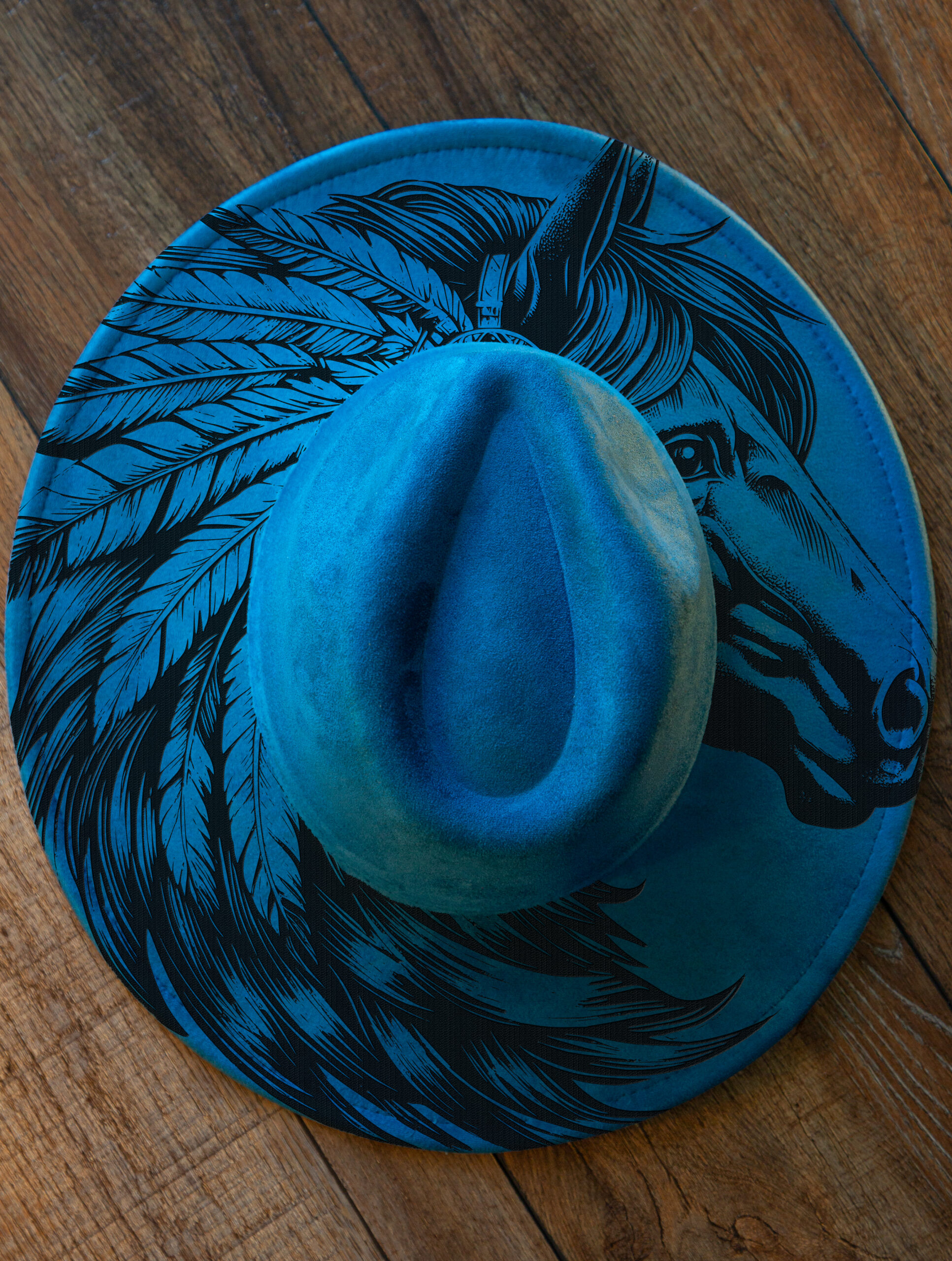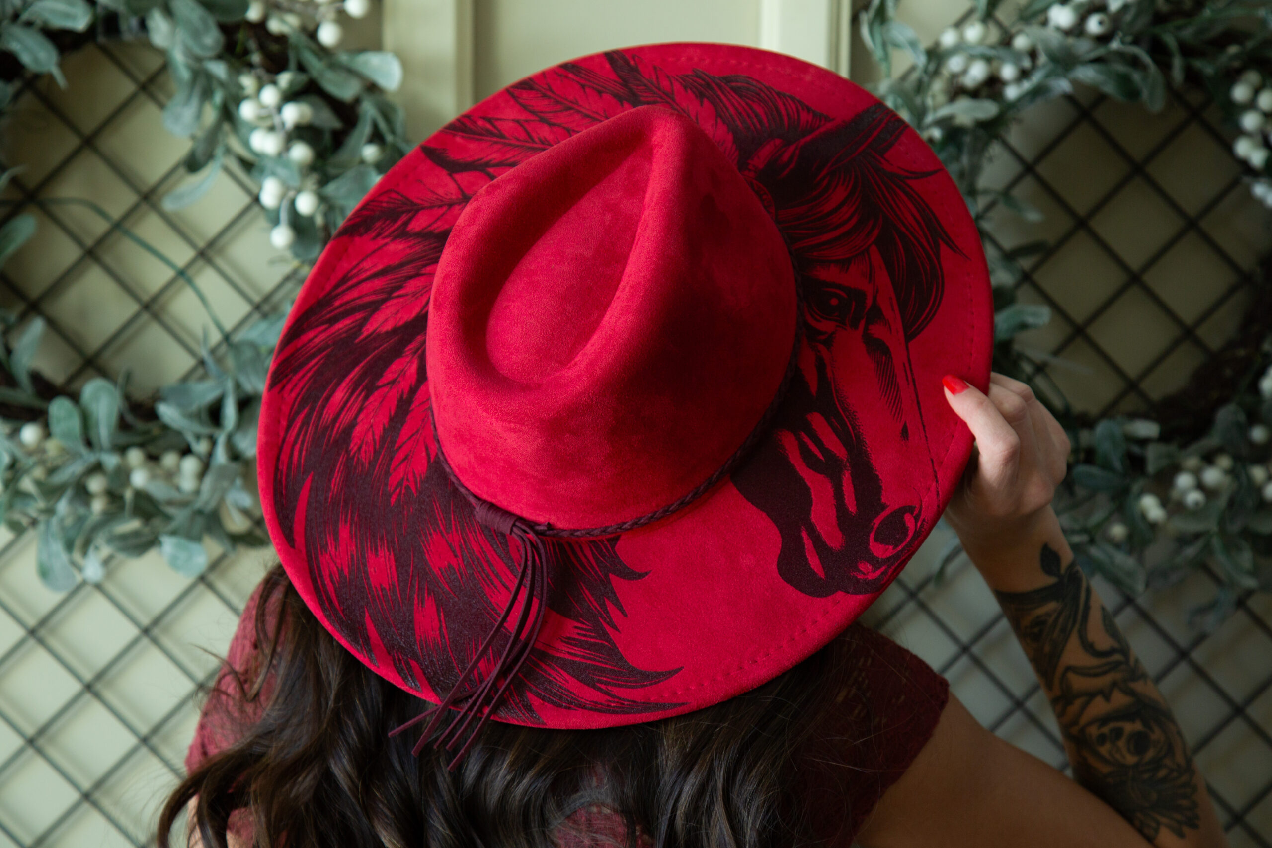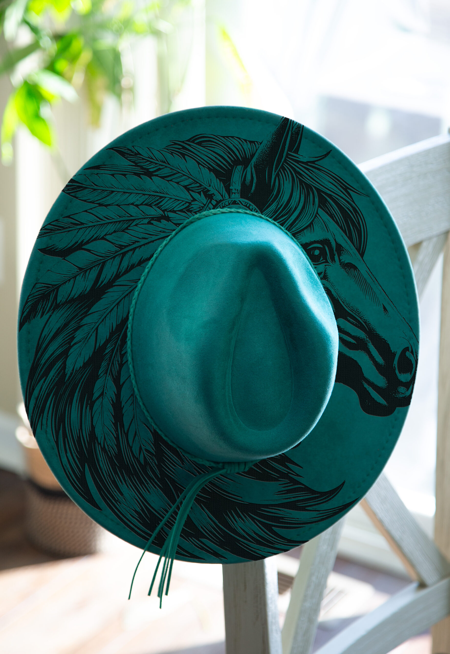 This engraved felt western hat features a detailed burned horse design across the brim, giving it a rustic ranch-inspired look that’s perfect for rodeo outfits, Nashville trips, country concerts, and festival fashion.